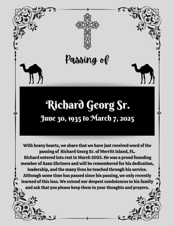 Shriners Black Camel represents our beloved Nobles who are no longer with us. If you know any noble who have recently passed please contact Azan Shriners at (321) 259-5302